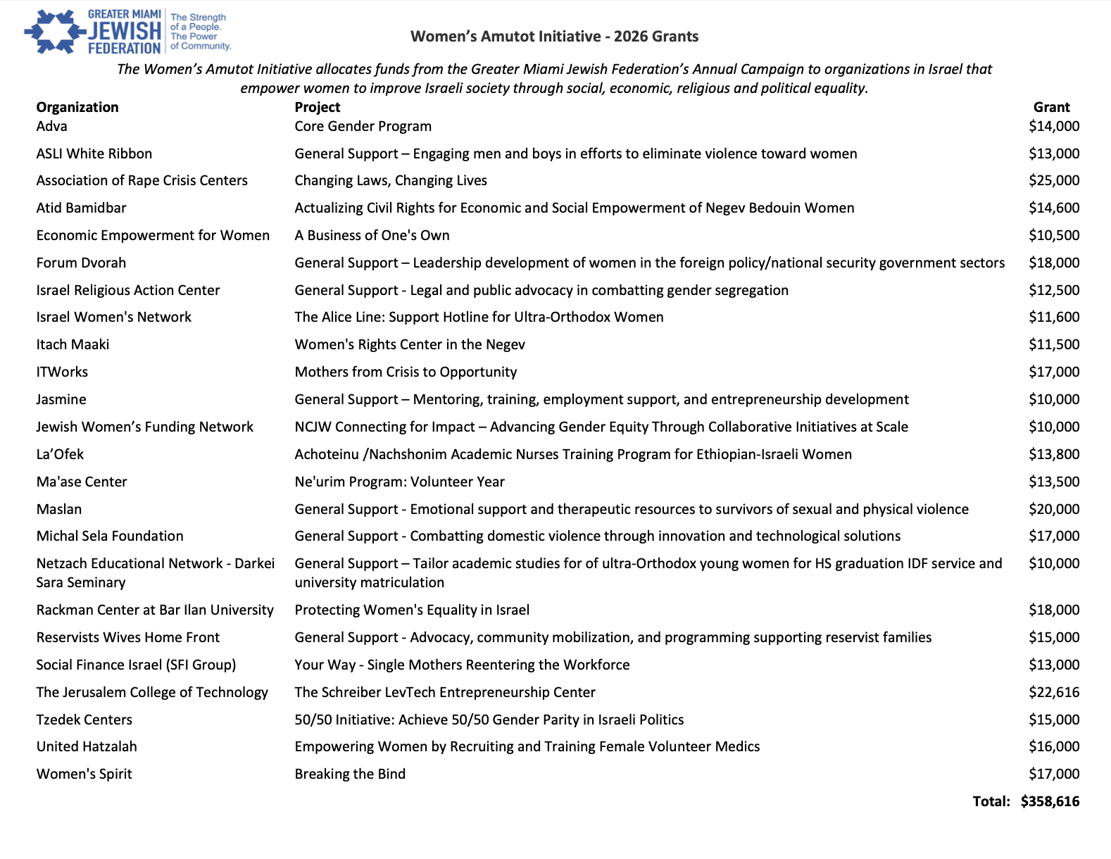 The Women’s Amutot Initiative allocates funds from the Greater Miami Jewish Federation’s annual campaign to organizations in Israel that empower women to improve Israeli society through social, economic, religious, and political equality. Click here to read more about the Women’s Amutot Initiative.