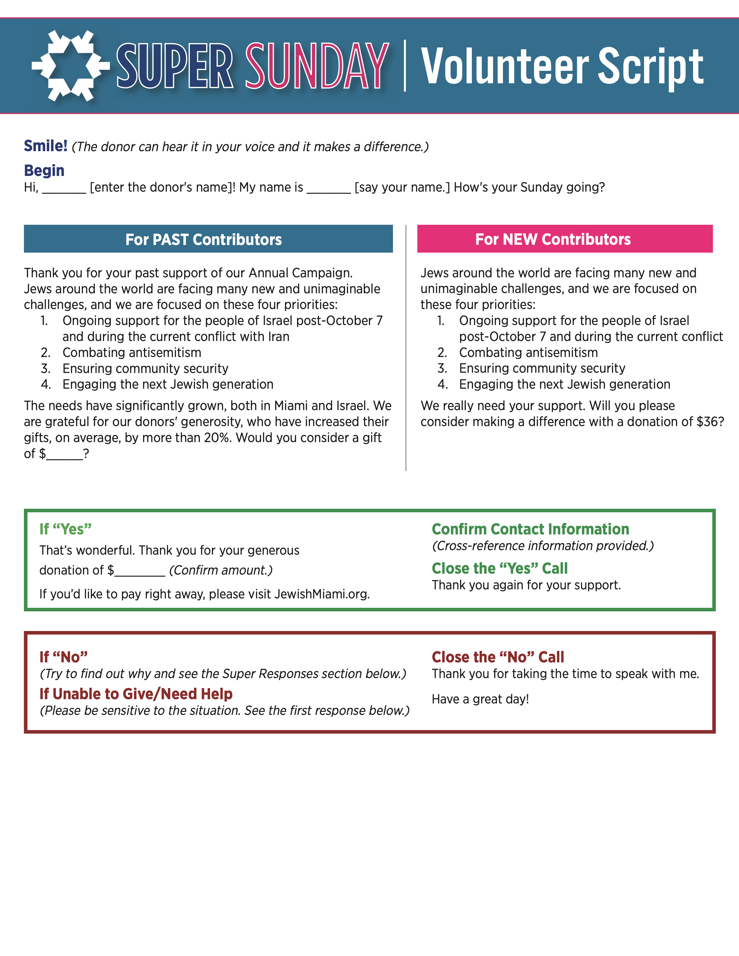 I’m a volunteer for the Greater Miami Jewish Federation and today is Super Sunday! Last year, you donated _____. Would you consider making a donation to the 2026 campaign? You can make a payment easily at jewishmiami.org/gift/supersunday